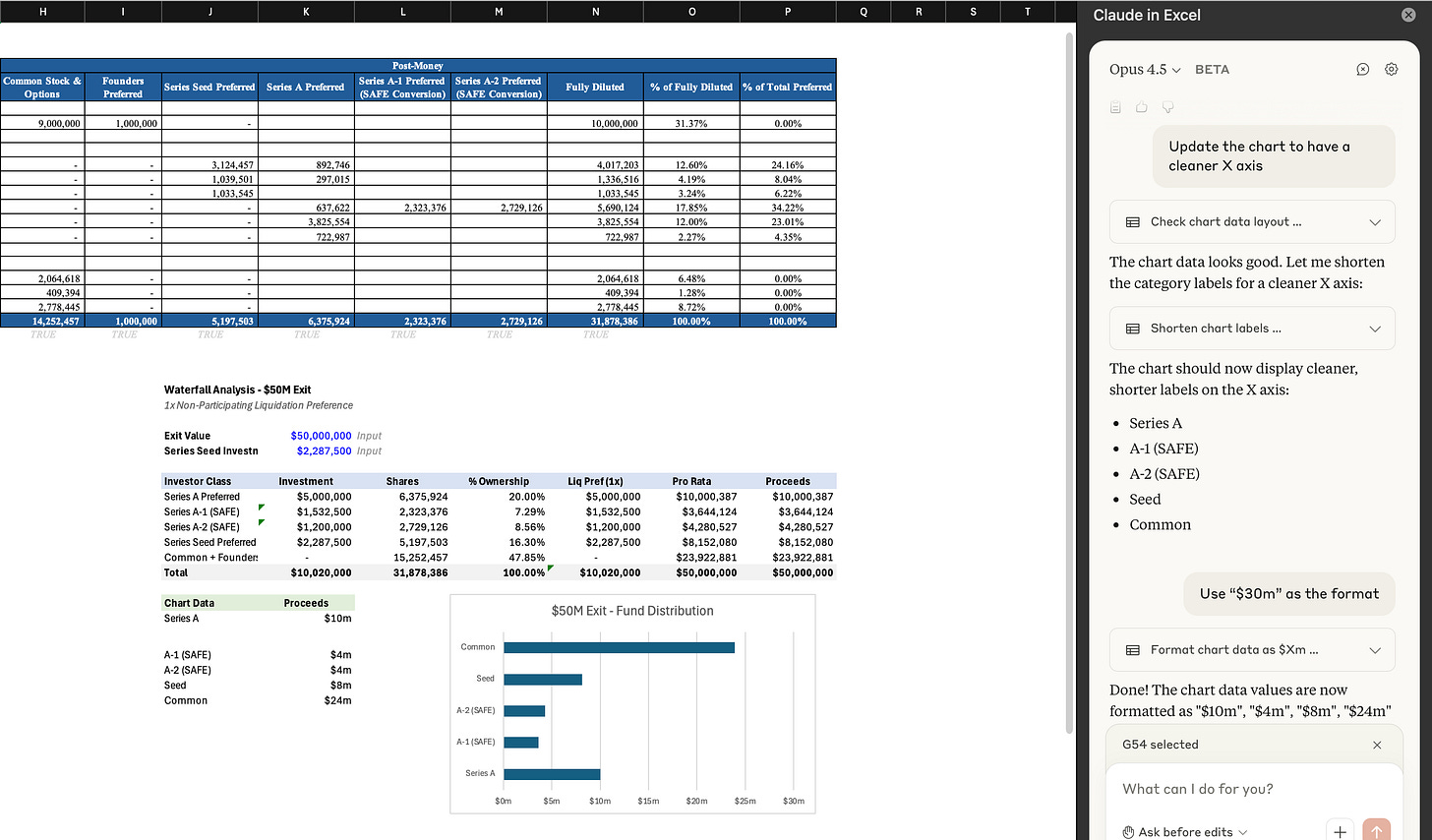 “Create a waterfall showing how the funds will be distributed on a $50 million exit, assuming 1x non-participating liquidation preferences from all VCs. Generate your graphic in Cell J25 and work right / down from there.”