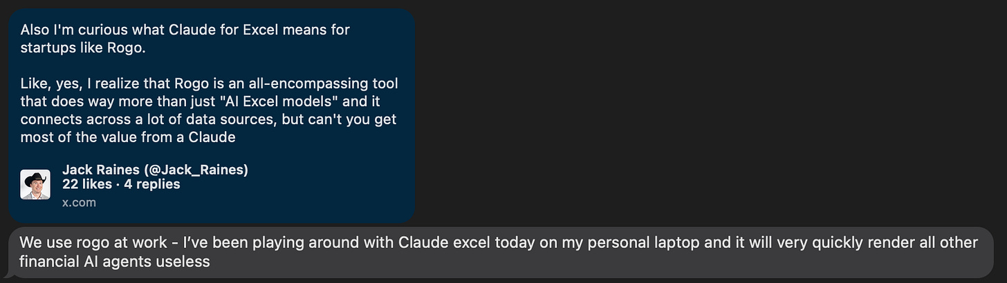 The value of “modeling skills,” at least defined as the “ability to do Excel fast,” drops to zero when you can ask AI to build a fully-fleshed out version of the thing faster than a human can type, taking out the “value” of a lot of entry-level white collar labor (IB analysts, consultants, etc) as well, at least as the work is currently done. This also, by the way, probably kills a lot of the “AI for Excel / AI for finance” startups that popped up over the last few years, particularly as Claude continues to integrate with data providers. One of my banker buddies thought the same: