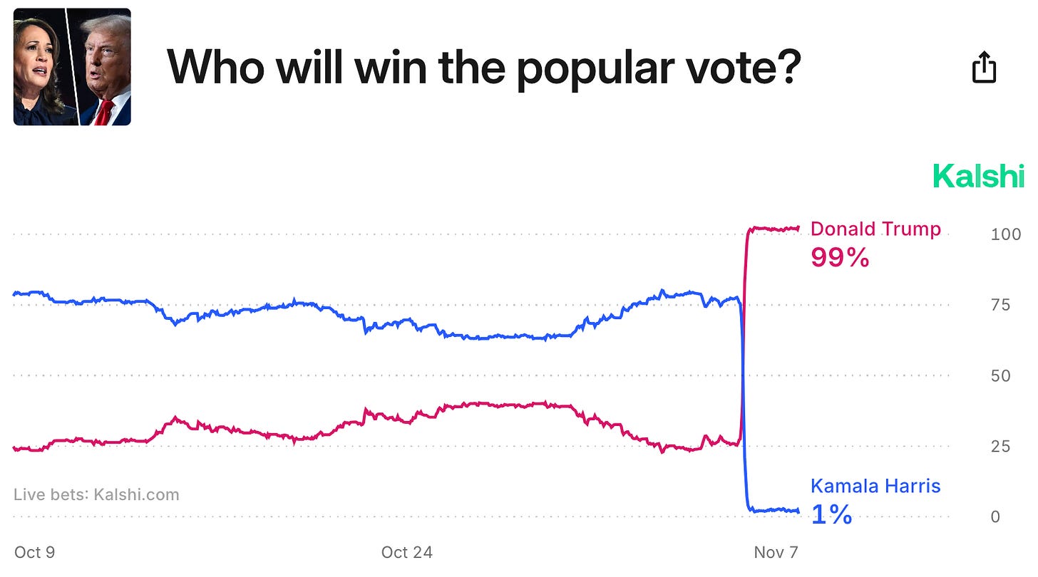 Something had to give, and as we found out Tuesday, that something was the polls. Trump didn’t just win a coin flip, the election was a landslide that saw him winning the popular vote, which no one, including prediction markets, expected: