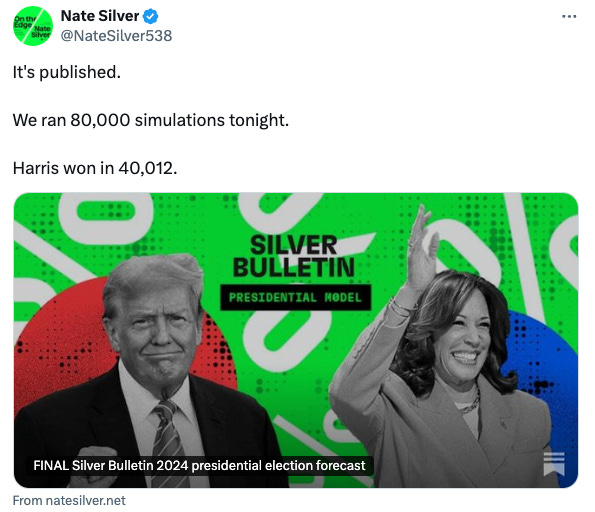 The last point proved to be especially important. Most polls, from Nate Silver to The New York Times, showed Harris with a ~1 point lead heading into Tuesday, and they considered the election a ~50/50 shot that could go either way. Silver even ran 80,000 simulations, just to determine that the outcome of the election would, basically, come down to a coin flip. God, I love statisticians. A thousand complex models just to say “maybe.” It’s incredible.