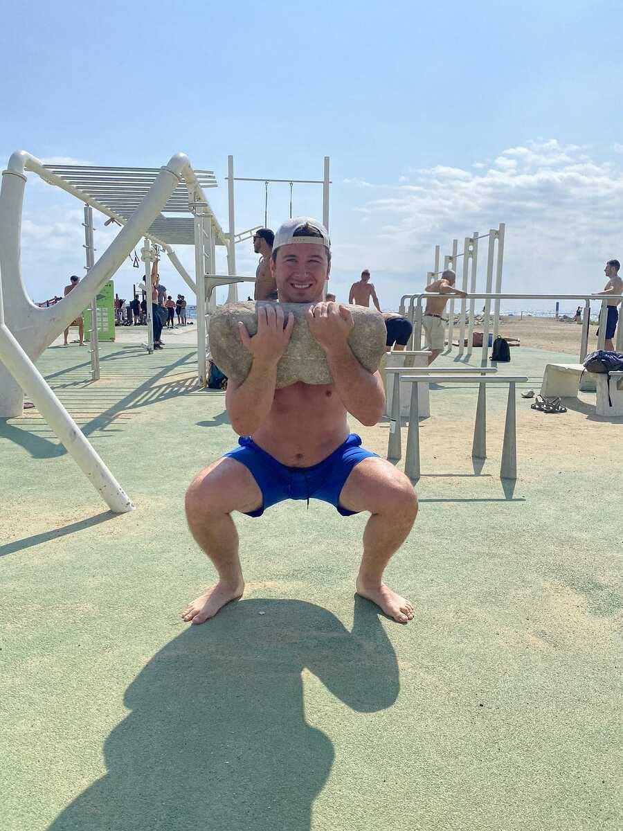 Rylan and Tanner hadn’t done much the day before, but we all met at the beach around lunch time today. Rylan and I both got a bit scraped up front squatting rocks (not a whole lot of options for leg day stuff),