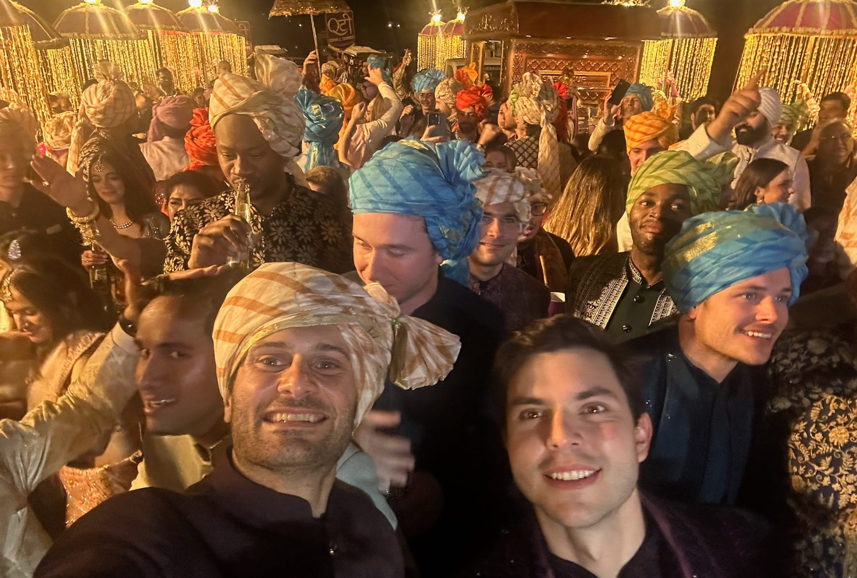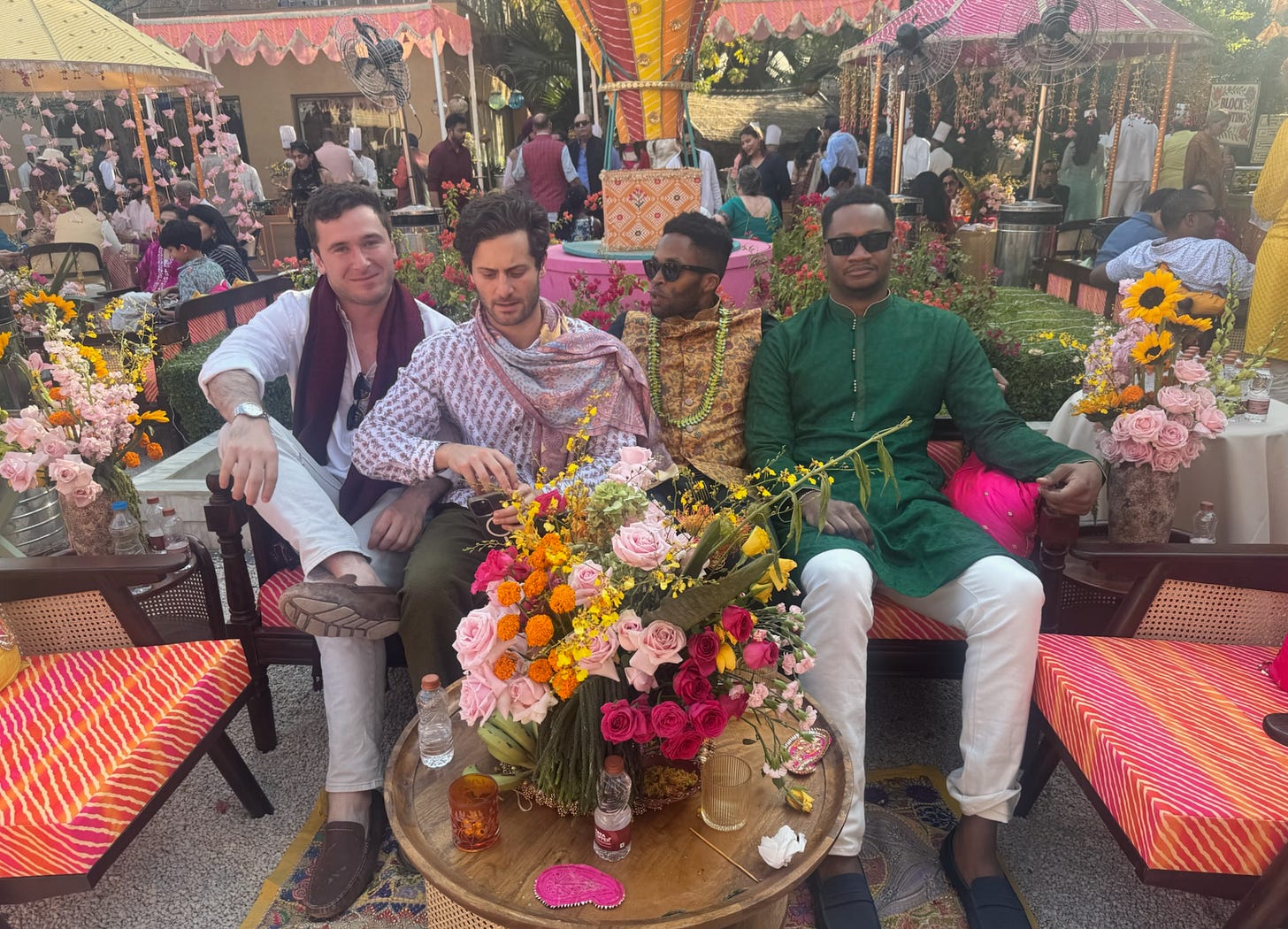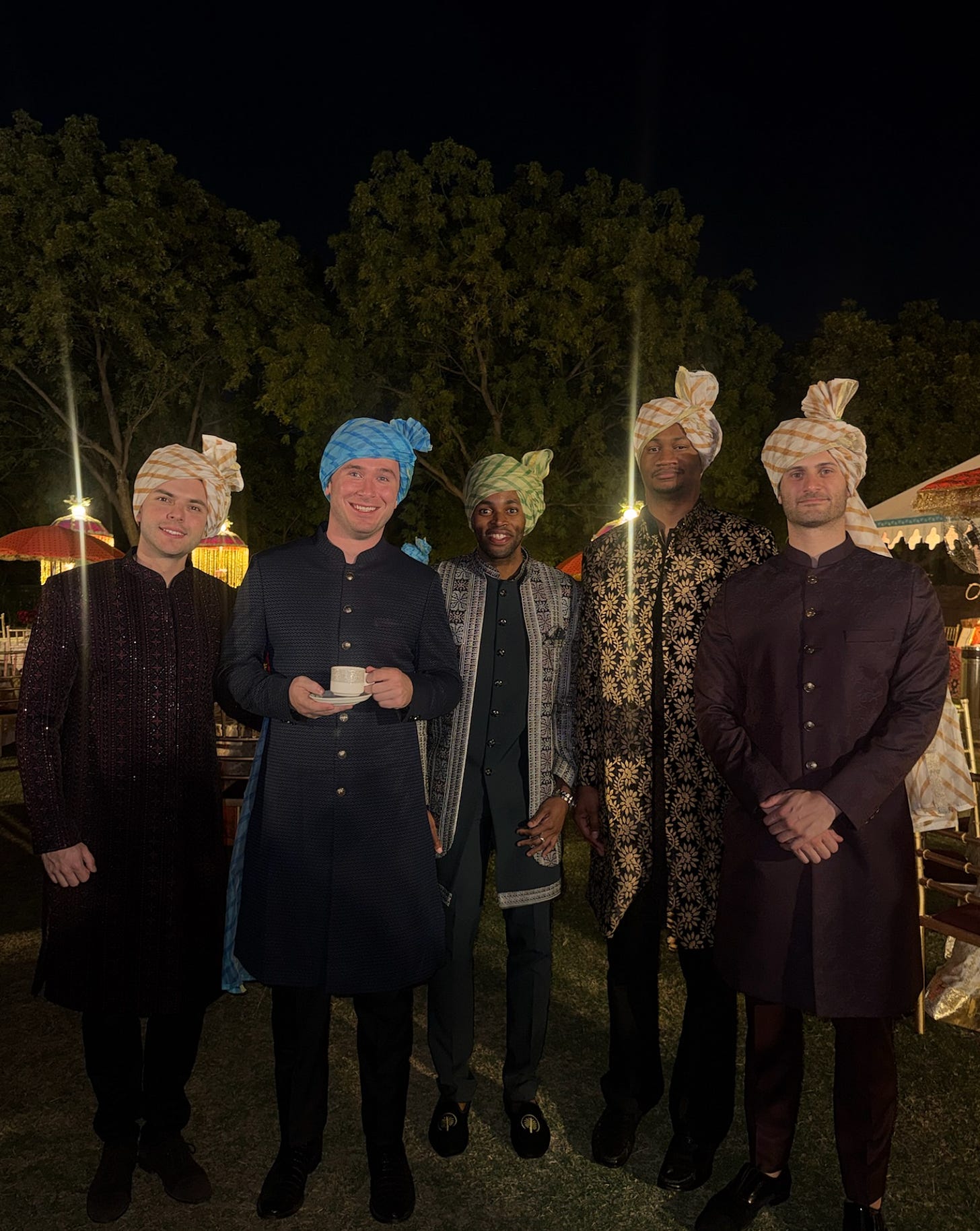 Wake up at 10:45, make breakfast right at close. End up sharing a table with the dude who bid $200k on the shoes; he’s hysterical. He also stole Brody’s backpack. Chat with a couple of Quinn’s friends as well. We all look terrible. Someone’s mother was in the restaurant; she found my jokes to be funny. Take another dive in the pool (cold plunge, Huberman would be proud). Then throw on a linen shirt and scarf for the Bahu Swagat. Hit the bar, grab a drink and some food. The band is playing. Turns out, I know half of the band. Toni, Sebo, and Ben are on the drums. “Not bad,” I think. I run back to the room. Come back down. Eight men from the wedding are in all black holding rifles. “These ceremonies are insane,” I think. Post up on a bench with Brody, Ben, and Lawrence. I’m exhausted; it’s been a long wedding. Stand up to watch Quinn’s parents dance. Then Quinn dances. It’s all beautiful. I grab ice cream. Lawrence tells me, “ice cream is a kid’s food.”