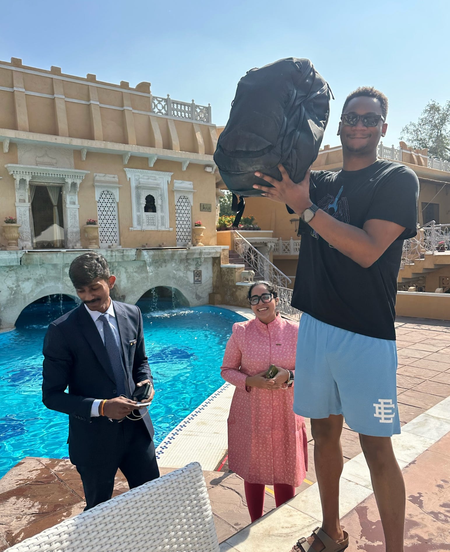 We receive a Whatsapp message from the wedding coordinator telling us to head outside and look for a sign saying, “Tanmaye and Quinn wedding.” We grab our bags, head outside, and are greeted by drivers with said signs. They have a list of names. We’re on it. I’m in a different hotel from the others, the Leela, so I walk to a cab with one of the drivers. Everyone in the parking lot is smoking cigarettes, which doesn’t bug me, because the entire biome feels like a cigarette. We get in a car, exit the airport, head down the highway. The roadways had no lanes, so the vehicles, like osmosis, quickly filled any loose space that might help them reach their final destination even one millisecond faster. We weave left, right, accelerate past bicycles with carriages attached to the back, people appearing out of nowhere to cross the highway on foot, and other taxi drivers dodging pedestrians. Somehow, no one hits anyone. Everyone navigating Indian roadways is operating in some sort of collective flow state. It’s impressive. I get to the hotel, and the guards open the hood and the trunk. I realize a few days later that this is routine for all taxis entering nice hotels. Every car gets searched. We pull up to the hotel. The driver gets out, gives me a slight bow. A hotel attendant walks up, gives me a slight bow. Grabs my bags. I walk through a metal detector and enter the hotel. The clerk gives me a slight bow, escorts me to the front desk. The reception gives me a slight bow, checks me in. I get my room key and head upstairs. There’s a knock on my door. The bag guy gives me a slight bow, drops off my bags.