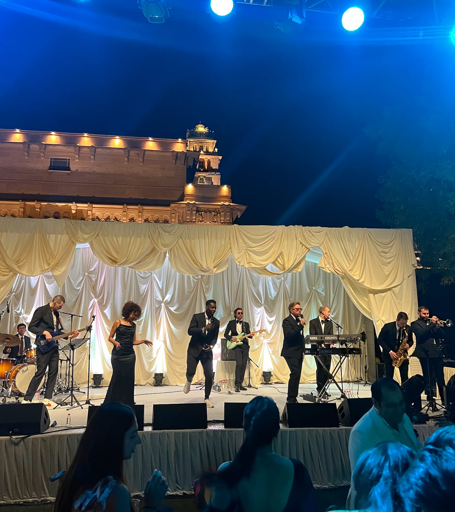 Then, back outside for the dinner (and, you guessed it: another party). I hit the buffet with Brody and grabbed a seat with our Columbia friends. There was a stage in the part of this courtyard a bit closer to the palace, where a band started playing; the dining area was further back. We started working our way to the stage. Then, siblings and friends gave speeches, with Toni and Ben representing the Columbia boys. Not bad, though I do have respect for people who can roll into a speech, no notes. Band plays a few more songs, it’s approaching midnight as they say, “This is our last one of the night!” (before the obvious, ‘one last song!’ that always occurs after).
