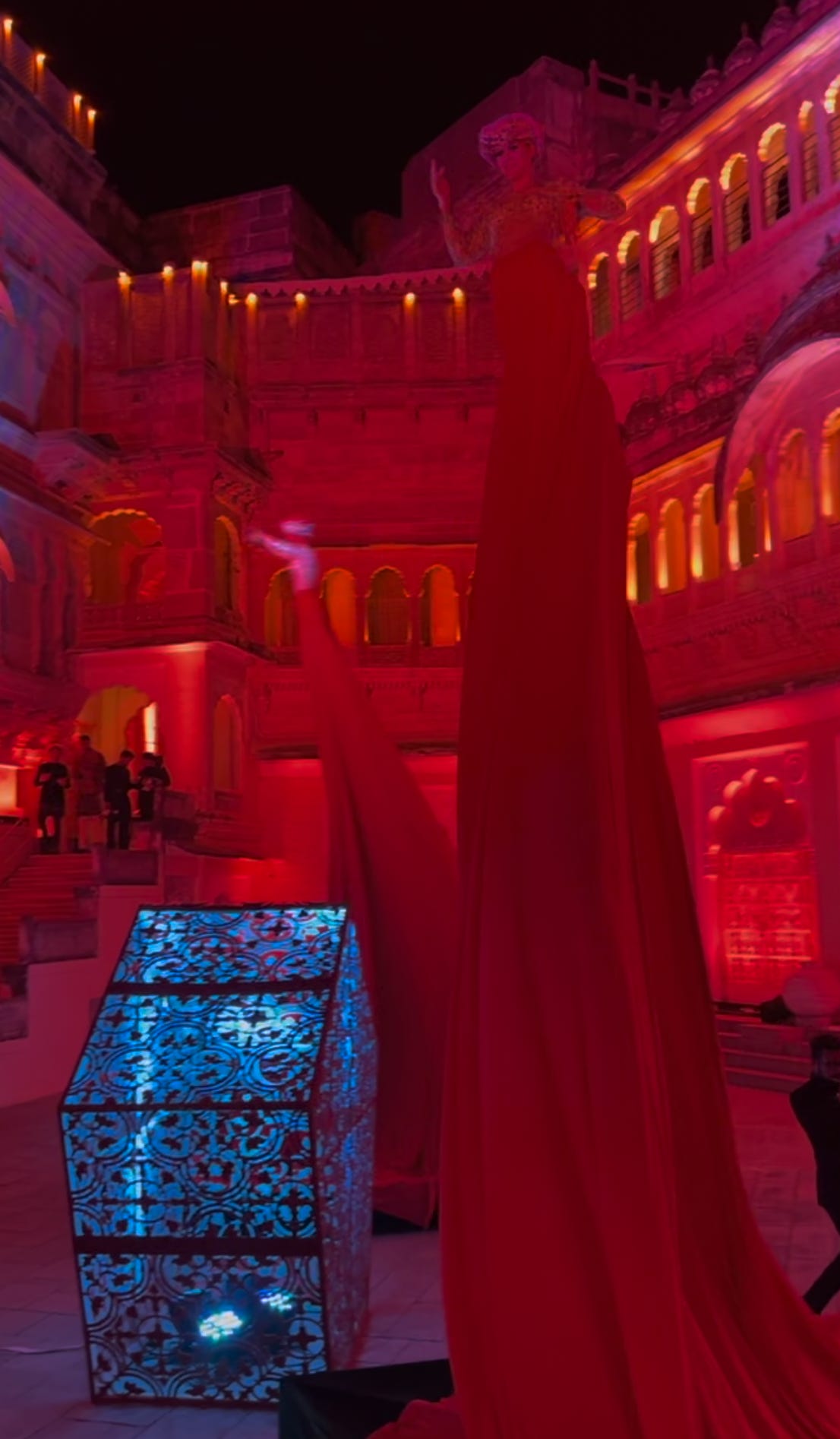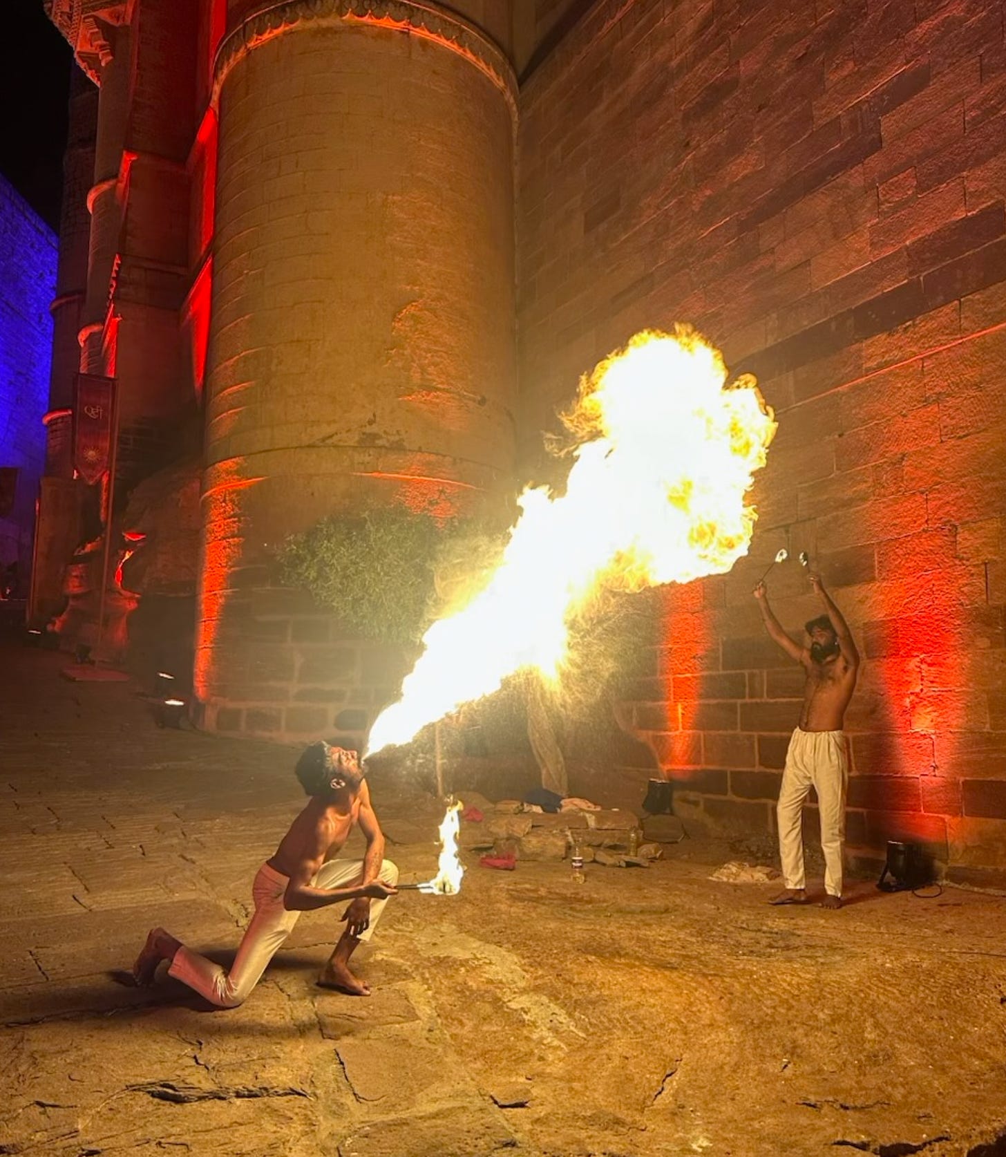 Tanmaye and Quinn arrive, the gates open, and they lead us on an ~hour pilgrimage to the top of the fort, where the first party in Jodhpur will take place. The walk through the fort felt like Alice in Wonderland meets Aladdin. As we reached higher elevation, we would peer from the ramparts toward the interior to watch exotic dancers move their bodies to hypnotic music. A half-dozen fire breathers performed a show. Two women in what must have been ~20-foot-tall stilts swayed back and forth to a rhythmic beat. And a few guys dressed as monkeys sprinted around on all fours, hiding in the castle walls before jumping out to intimidate guests. I said I wasn’t going to drink after my stomach issues. This was not an event to experience sober. I took imodium and hammered my third cocktail of the evening.