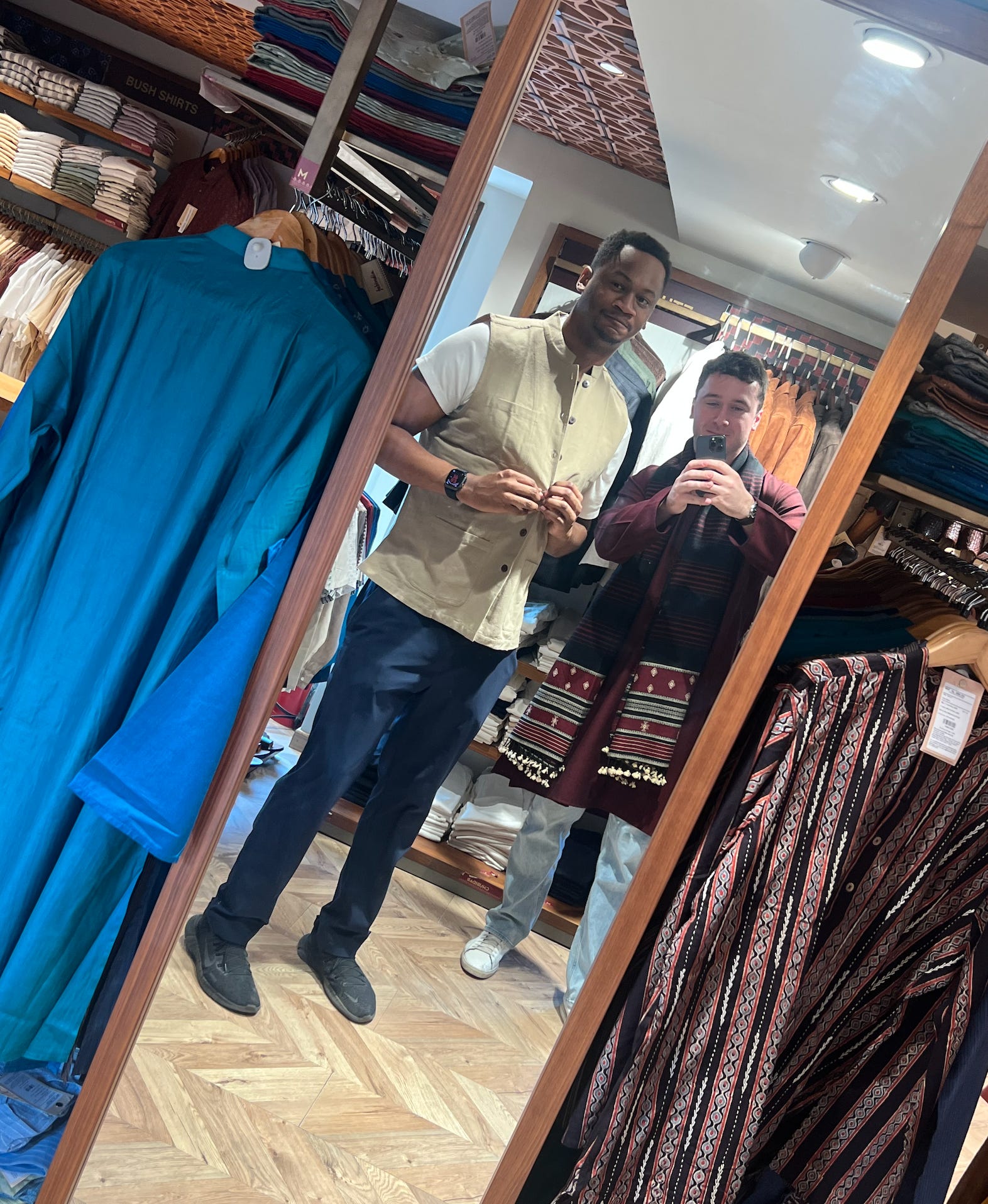 Brody takes us to what must be the nicest shopping area in New Delhi. We enter this boujee, white-washed complex with a Ralph Lauren store near the entrance and walk into a traditional Indian clothing store. The manager of the store, who was quite metrosexual (he would have fit right in in Brooklyn), immediately starts taking kurtas off the hangers for us to try on.