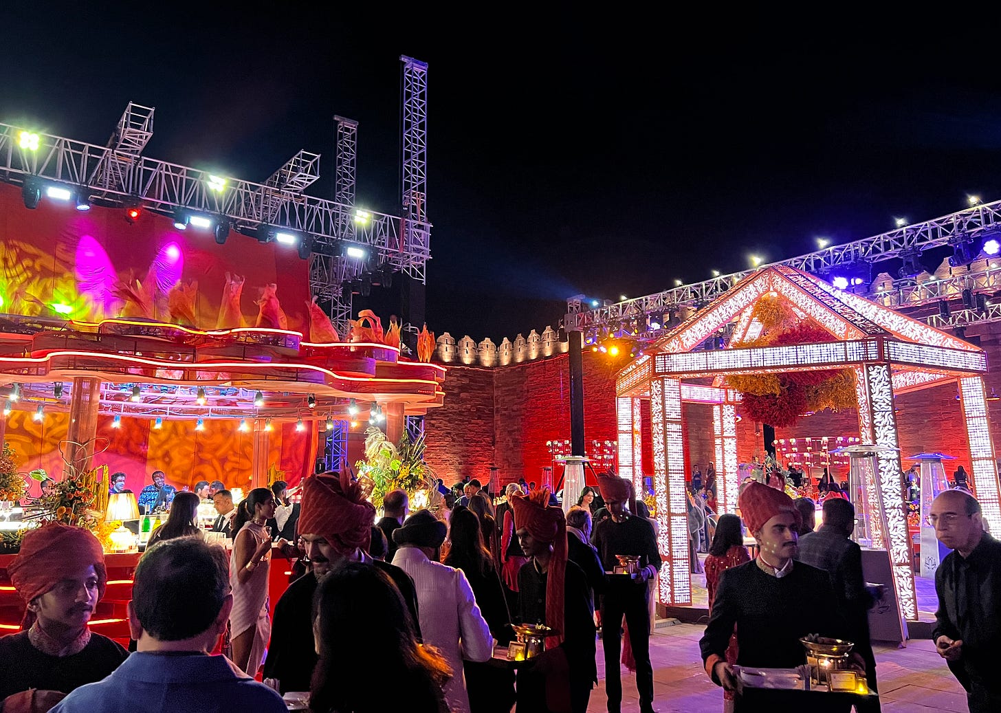 We pull up at the fort, and massive spotlights are painting its wall with a wedding logo. More camels. More trumpets. A bar outside; more champagne.