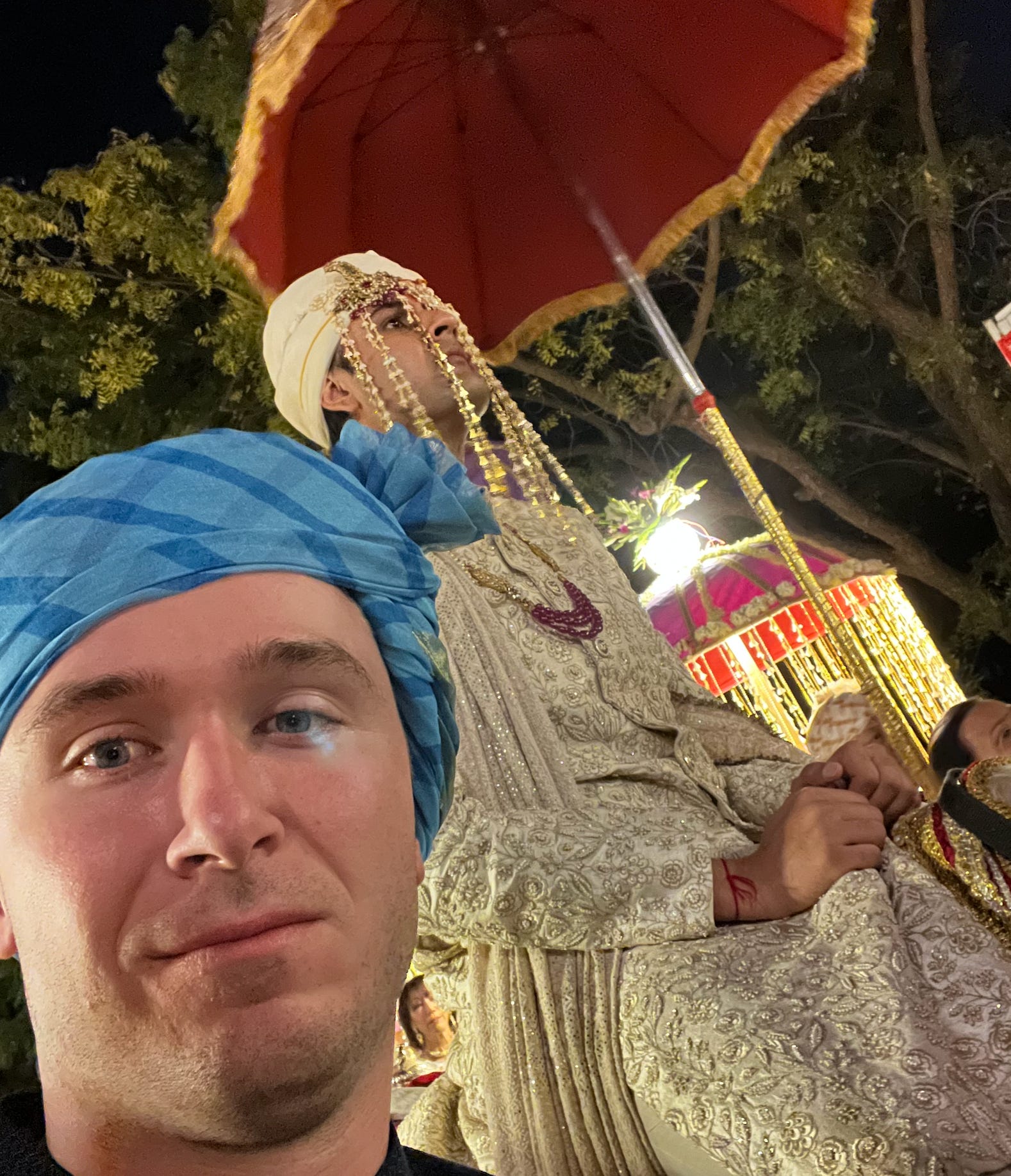 There’s a small stage set up, plus two bars and some food stations. There’s also three seats next to a couple of mirrors, where I see someone having a turban tied to their head. I grab a blue cloth and sit down. An Indian dude twists part of the cloth and says “hold.” I hold. Over the next five minutes, he twists this cloth around my head an impossible number of times. Ben is snickering taking pictures. I look in the mirror. I like the turban look. “Maybe I’ll make this my new Linkedin photo," I think to myself. I grab a tea. Then a beer. Everyone else gets their turbans. We take photos and crack jokes. Then Tanmaye takes the stage for what would be an hour-long ceremony in which he got a gold turban and lots of jewelry. Back to the street.