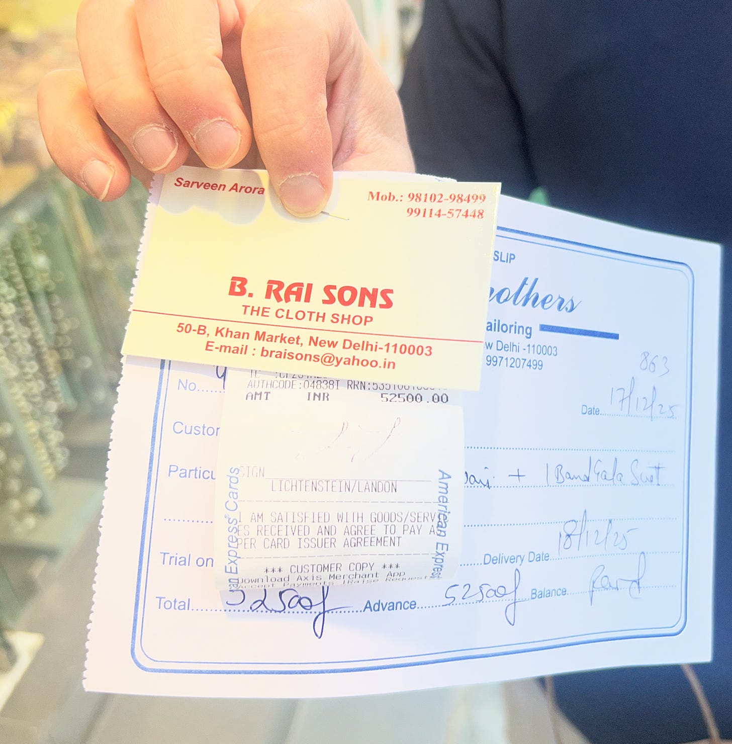 We ran into Jacob, one of Tanmaye’s friends from Northwestern, and Laura, his wife / one of Quinn’s friends in one of the 27 clothing stores in this Delhian alley. Jacob was already fitted in Indian apparel. We weren’t huge fans of store number one, so we kept walking until we found a tailor: B. Rai Son’s. This was the right store.