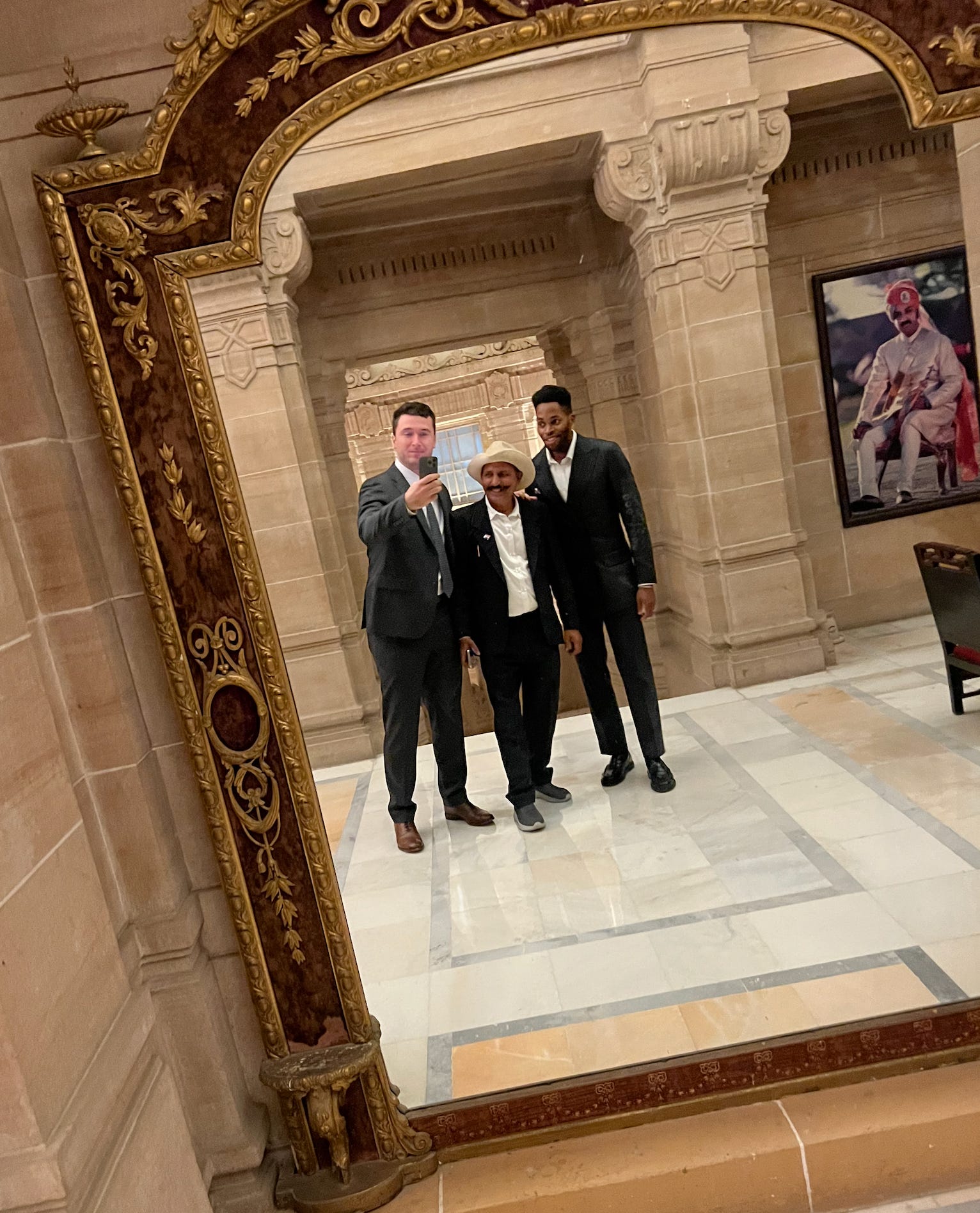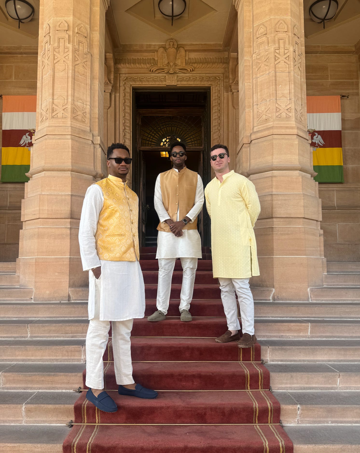 We head back to the palace, where workers were busy constructing a massive stage for what I assumed to be the Indian wedding that night. I was directed down and to the right through a series of hedges to another bar and dining area near a nice pool. I was wearing a yellow, shiny kurta. Brody, Lawrence and I stopped to take some pictures and aura farm.