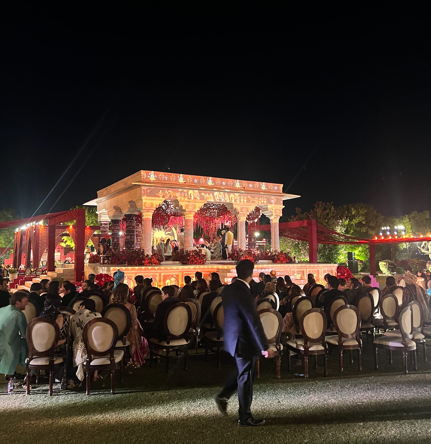 We walk downstairs behind the palace. Construction was complete, I was looking at a scene from Star Wars or Dune. Walk down the red carpet on the stairs to a stage with a spotlight on it, waiting for the couple of the evening. Two bars, in elevated buildings, to the right and left, with red carpets leading to them as well. Seats facing the stage in front of me, then more seats, further back, facing a newly-constructed temple, which I presumed would hold the evening’s ceremony. Brody and I grab seats in the bar/building construct on the left. We wait. And wait. And drink. And wait. Suddenly, the most intense music of the weekend kicks off. I mean it was like the movie 300. Tanmaye takes the stage. Then Quinn is escorted down, her head covered by some sort of cover carried by her family. Drones are flying around at 50 mph recording from all angles. Fireworks explode to my left and they take the stage to my right. I notice a dining area further behind the temple to my left. Brody and I walk over.