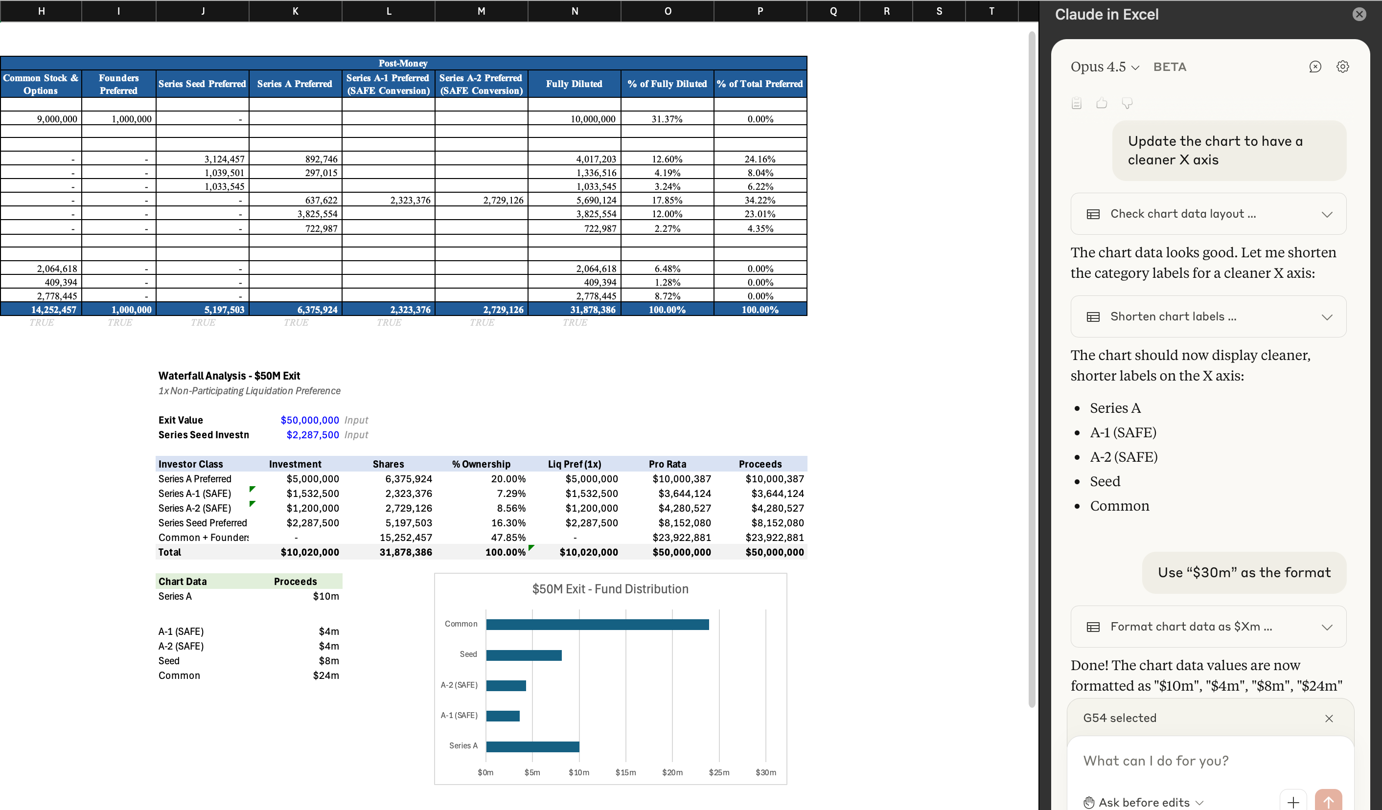 “Create a waterfall showing how the funds will be distributed on a $50 million exit, assuming 1x non-participating liquidation preferences from all VCs. Generate your graphic in Cell J25 and work right / down from there.”