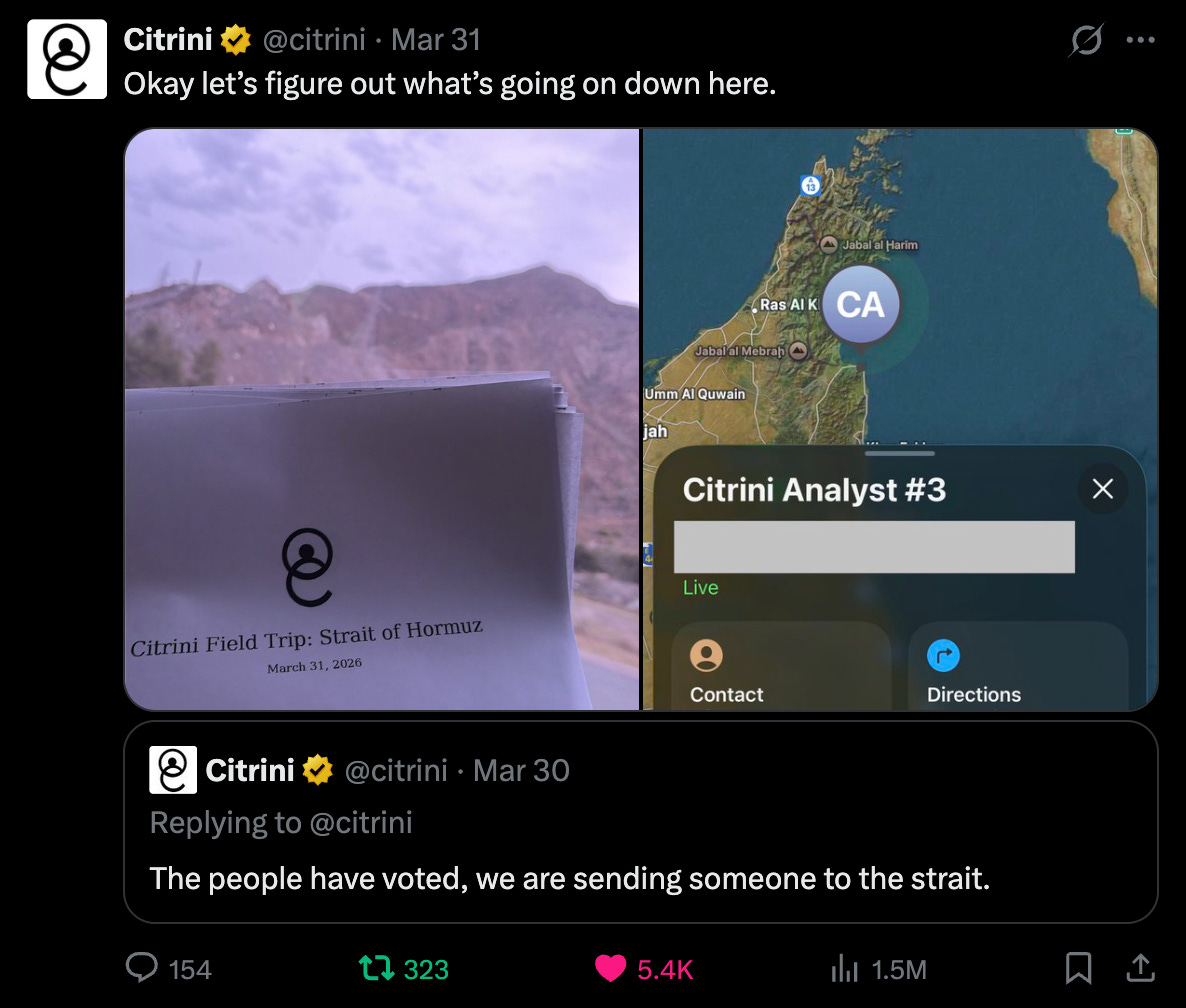 Citrini is a research publication that also trades its own book, and in this case, they did adjust their portfolio positioning based on what their analyst saw in the Strait, from tanker traffic to anecdotes from Omanis and Iranians he met sharing their thoughts on how they believed the conflict would play out.