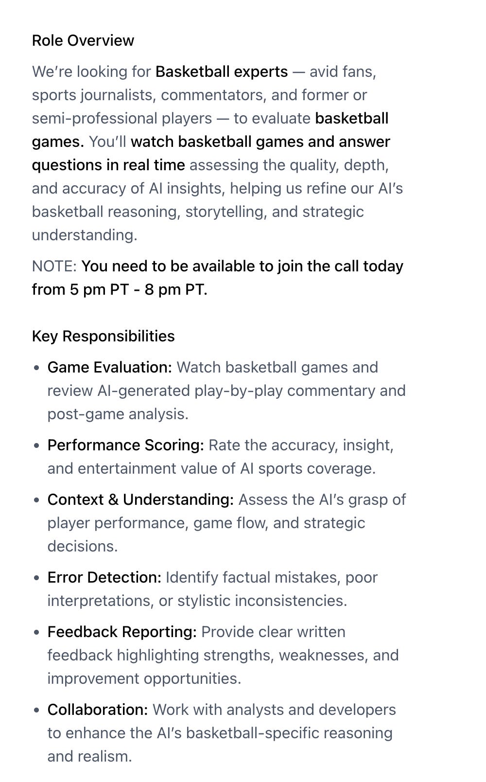 To land one of these opportunities, you take a recorded “AI interview,” your information is saved, and then you can apply for open positions on their site. Here’s a couple of example job listings for “audio and video technicians” and, hysterically, “basketball experts.”