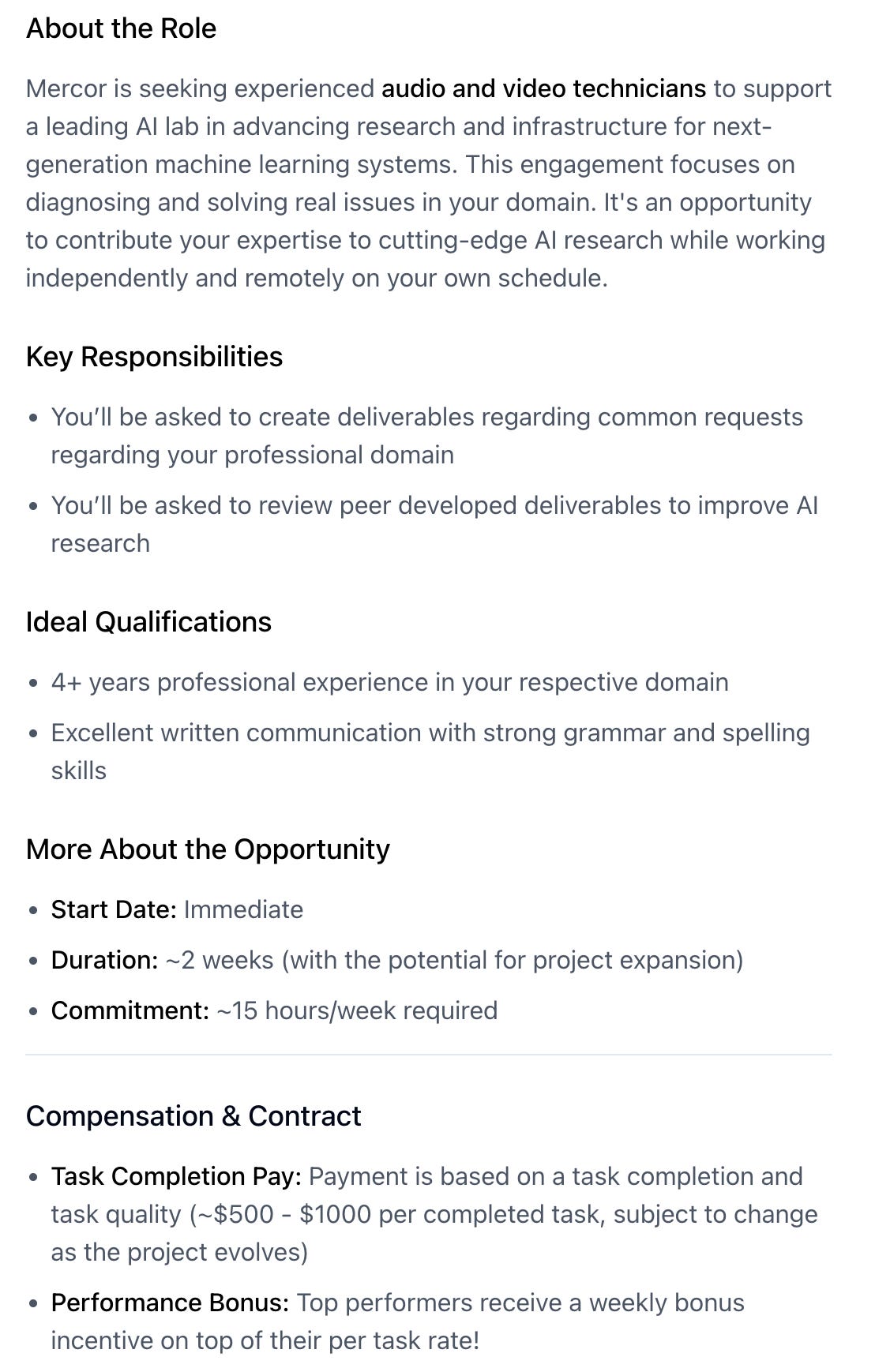 Those opportunities involve, essentially, creating workflows that mirror what you do in your job, and selling those workflows to AI labs via Mercor. For your efforts, you’ll earn anywhere from ~$50 to $150 per hour, or ~$500 to ~$1,000 per project. Put differently, you’re being paid to help train AI models to do your job.