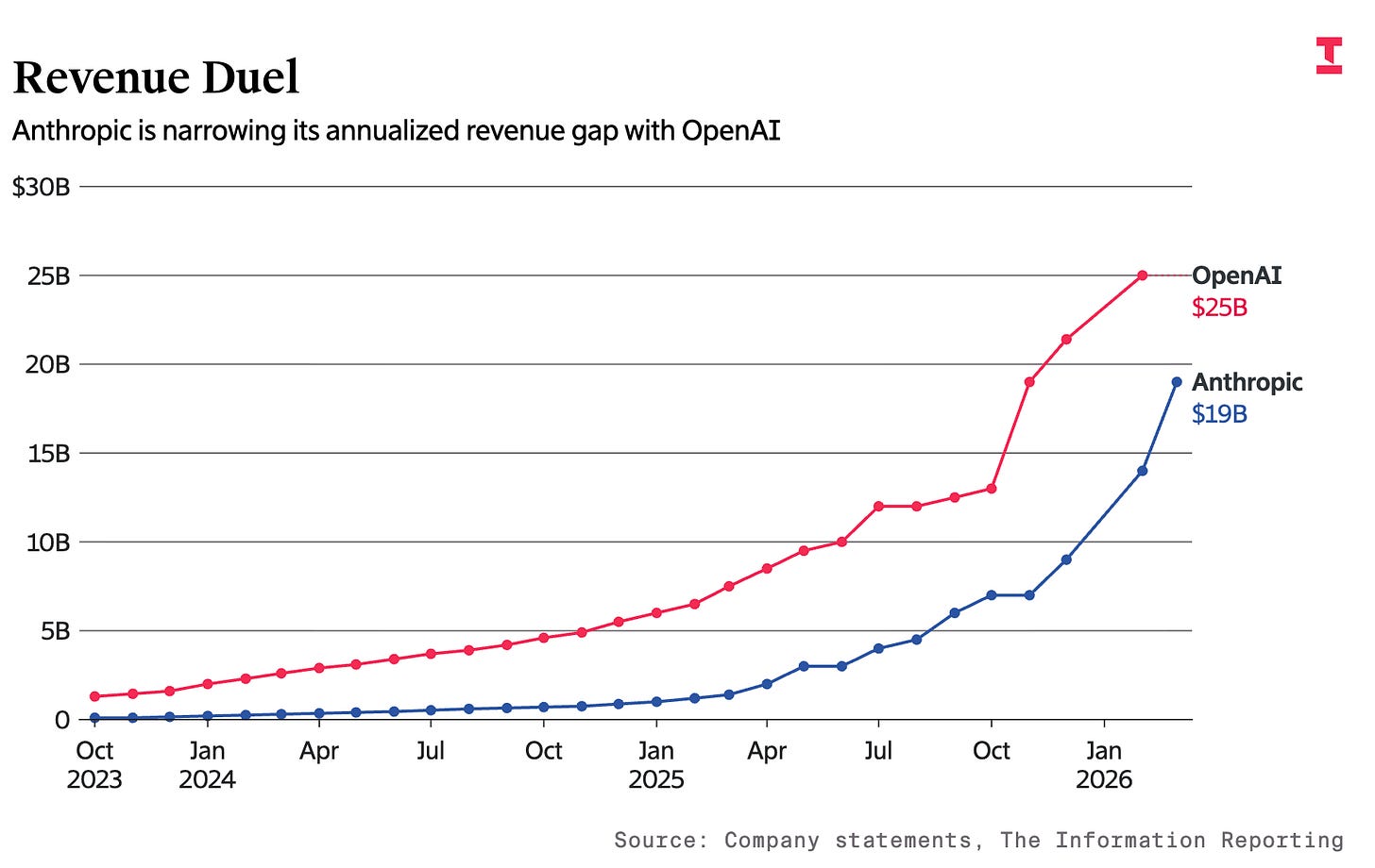 In January 2025, OpenAI’s annualized revenue was $6 billion and Anthropic’s was $1 billion. By October 2025, OpenAI’s was $13 billion and Anthropic’s was $7 billion. By March? Anthropic had reached $19 billion in annualized revenue, closing in on OpenAI’s decelerating annualized revenue (~$25 billion in February).