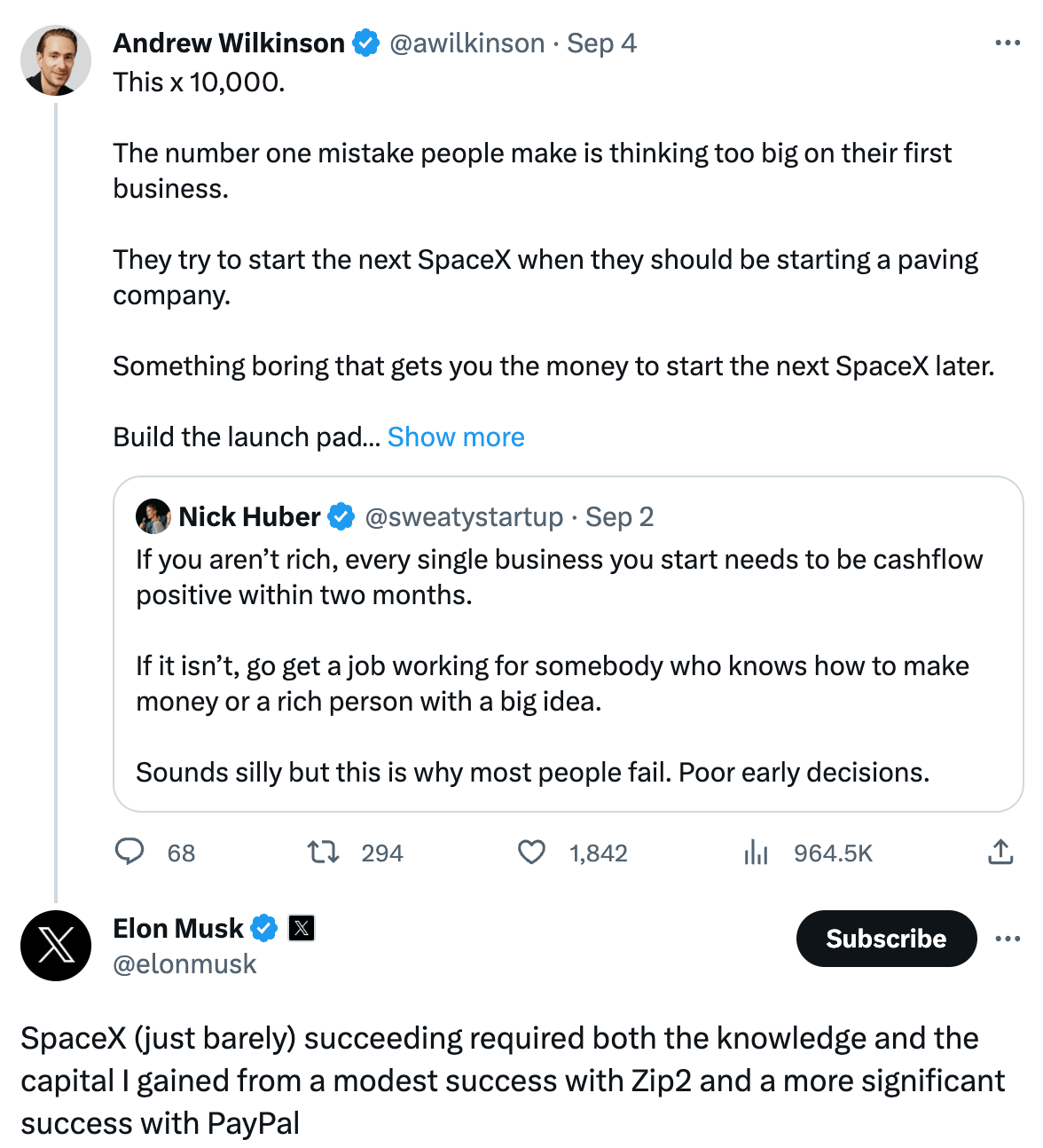 Don’t believe me? Even one of the greatest entrepreneurs of our time, Elon Musk, admits that SpaceX would have failed without the capital he had gained from his previous ventures: PayPal and Zip2.