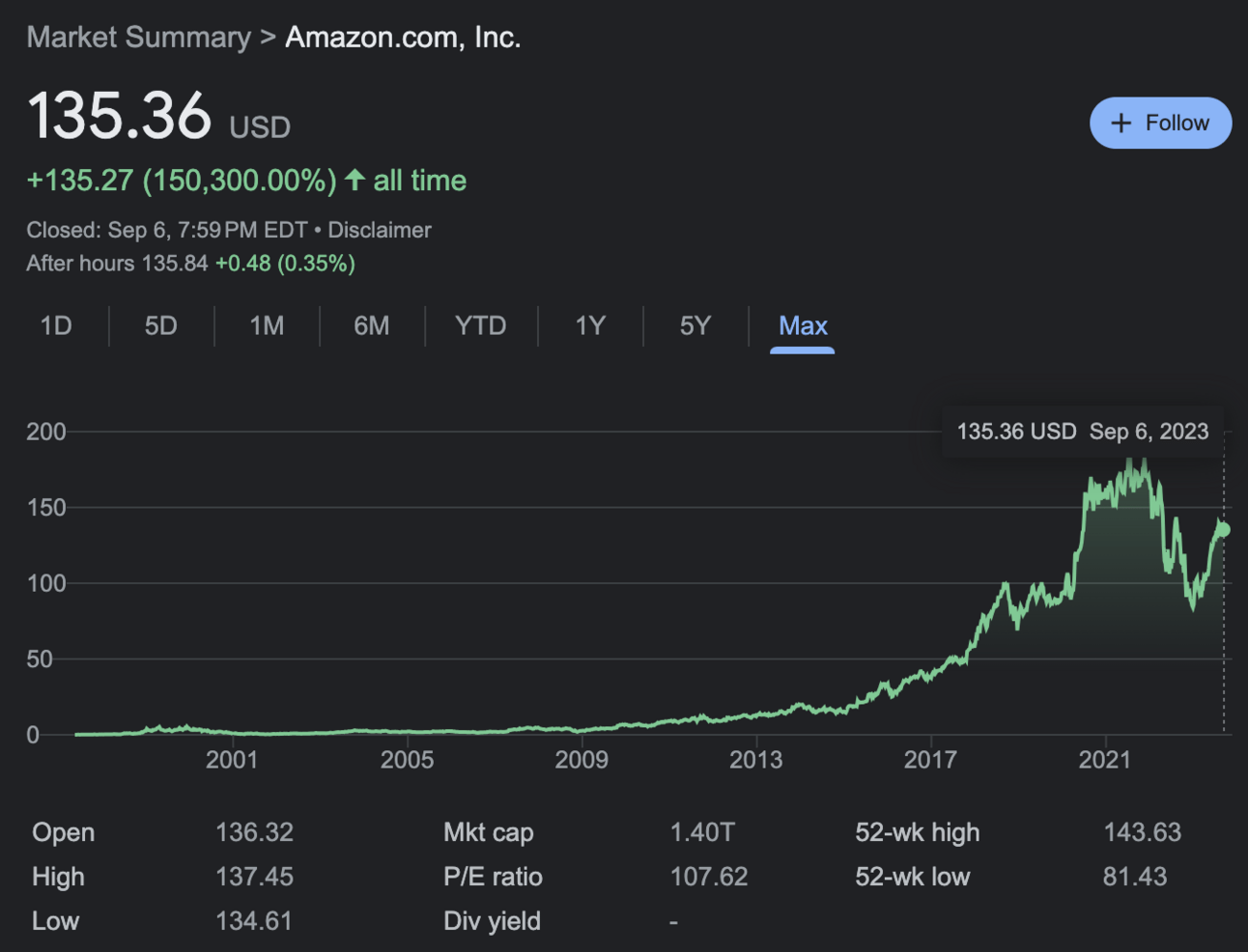 Despite its stock price collapsing by >90% from its peak, Amazon managed to survive the tech apocalypse of the early 2000s and grow into a $1.4T company.