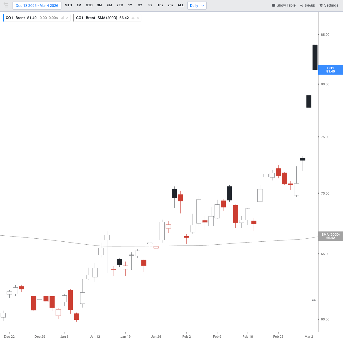 And oil futures did, initially, spike on March 1, with the price of Brent crude (global benchmark) jumping from ~$70 to ~$80 a barrel. But, still, markets weren’t pricing in Armageddon.