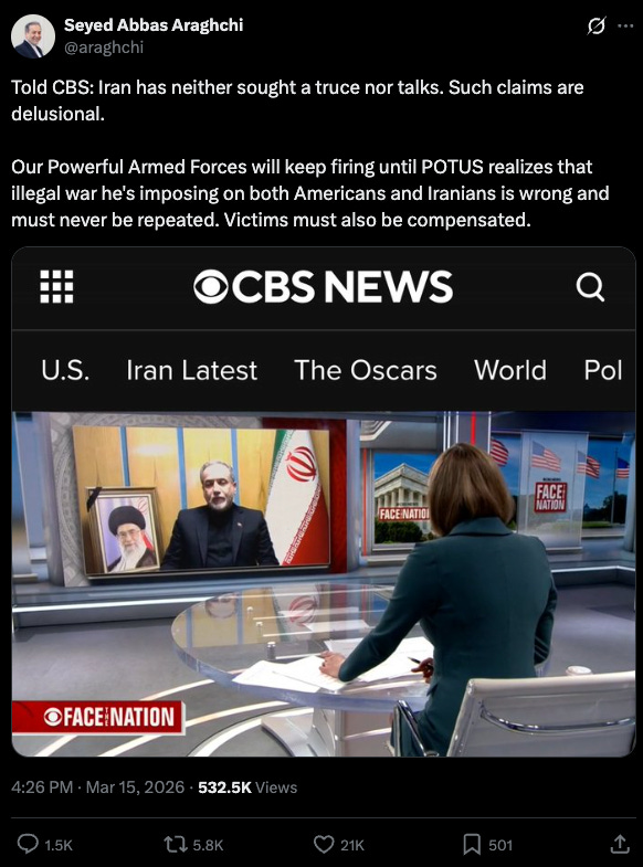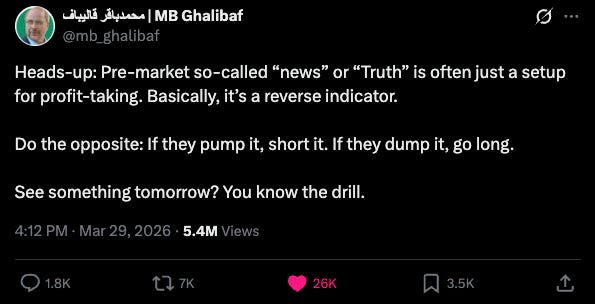 20% of the world’s oil production goes through the Strait of Hormuz, and I don’t think it was a crazy extrapolation to think that, once the US and Israel decided to “Leroy Jenkins” the Supreme Leader of Iran and half of his cabinet, that Iran might retaliate with strikes against US assets in the Middle East and, in general, cause chaos in global energy markets. After all, if your country is going to shit, why not wreak havoc on the rest of the world on the way out? So, now, data centers and hotels are being quickscoped by rockets and drones, the Strait of Hormuz is an IRL game of battleship, and the speaker of Iran’s parliament is tweeting out macro-trading strategies for futures markets.