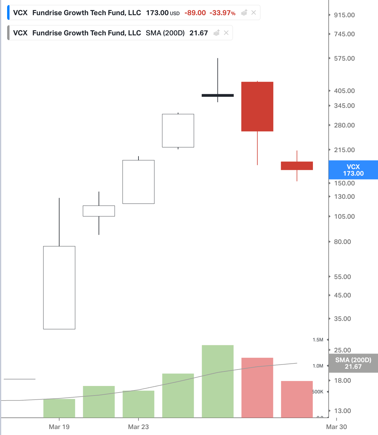 So, the conversion gets approved, and now you have a situation where most of the shares (likely > 90%) are locked up in a fund that owns Anthropic, OpenAI, and SpaceX: the hottest private companies in the world. This trade went about as you’d expect: after opening at ~$31 per share (50% above NAV) with 90%+ of the float locked up, the stock proceeded to climb from $76 on the 19th, to $105 on the 20th. Then we had a weekend where, presumably, more retail investors discovered the fund, and by the following Wednesday, VCX was trading at ~$575, or ~30x NAV. Basically “valuing” Anthropic at ~$15 trillion.