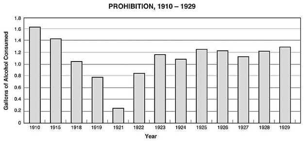 So alcohol grew more dangerous, crime rings grew more powerful, and guess what else? After a brief one-year dip, American alcohol consumption climbed right back to pre-Prohibition levels.