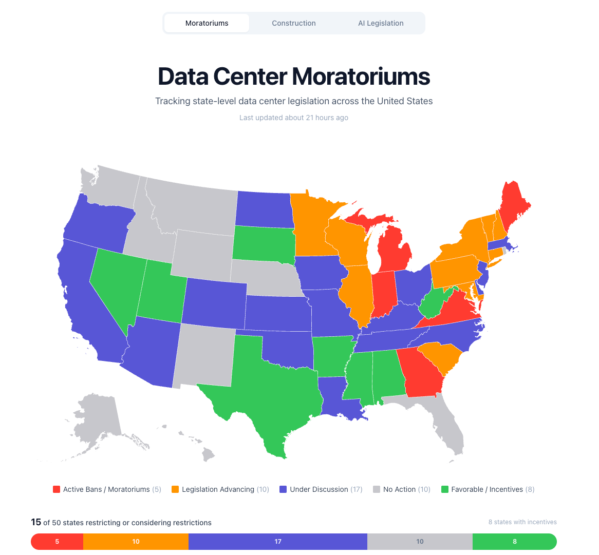Will Manidis made a site tracking data center moratoriums in the US by state. Guess what? five states have active bans, ten have legislation advancing, and seventeen are under discussion.