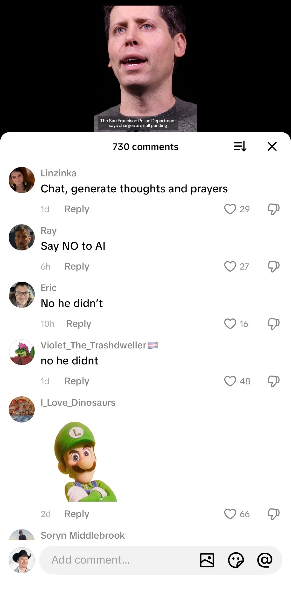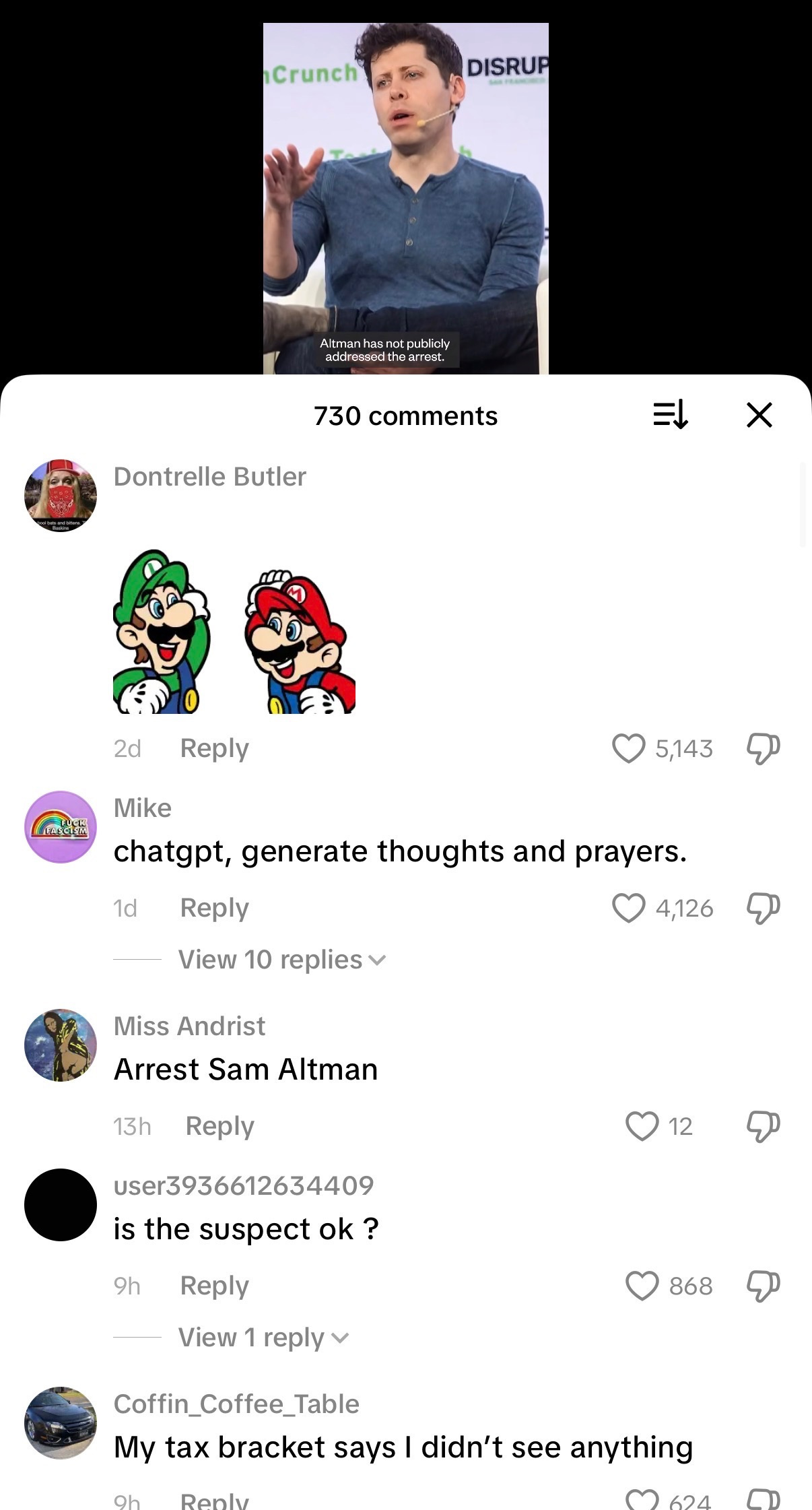 Young males are, compared to other demographics, prone to violence, disorder, and destruction if their life is otherwise in disarray. And people really, really hate AI. Look at the TikTok comments on posts about Altman’s home being attacked. It’s a mixture of satire, crude irony, support for the attacker, and allusions to Luigi Mangione.