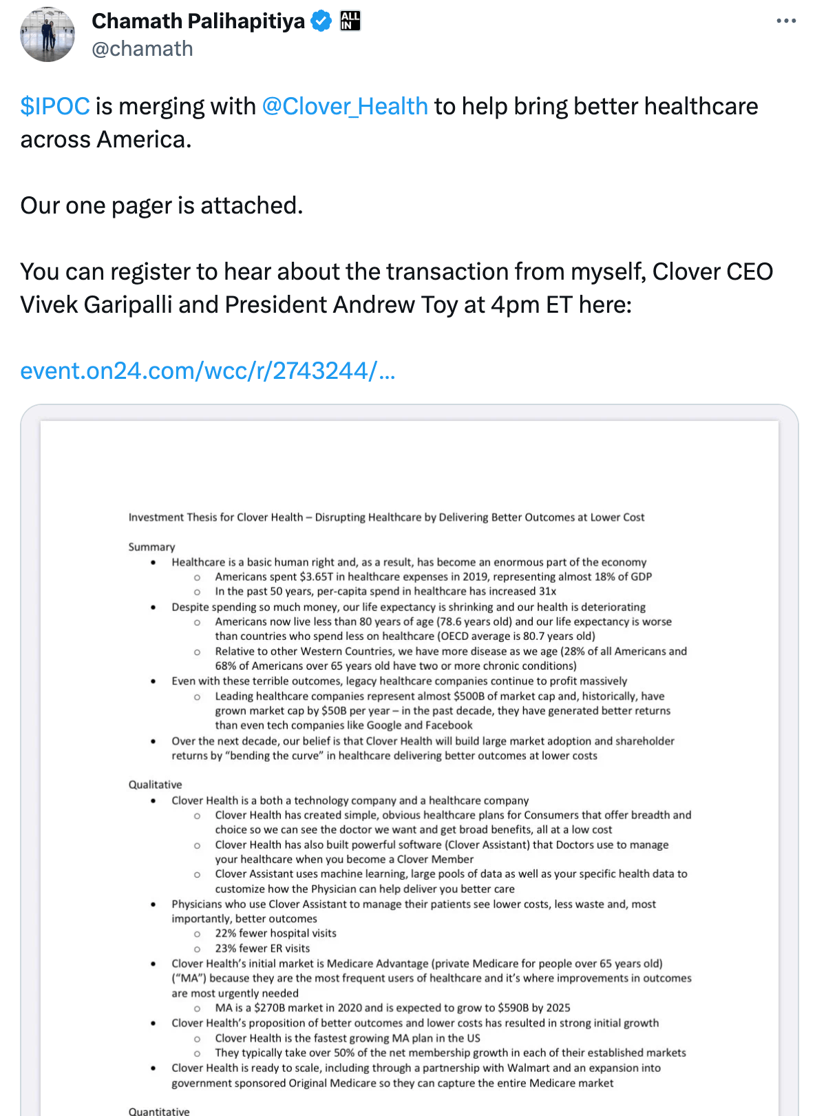 Chamath was very active on Twitter, and he painted himself as the billionaire on the Little Guy’s side, the man democratizing access to financial markets by giving retail investors access to these SPAC deals (deals that, if closed, he would stand to make millions from, regardless of stock performance), so they could invest in “disruptive” companies pre-IPO. And anytime one of his SPACs signed a binding merger deal, he tweeted out a one-pager investment thesis to his 1.3M followers. These followers rewarded his generosity by running the stock’s price up 50, 100, and 200%