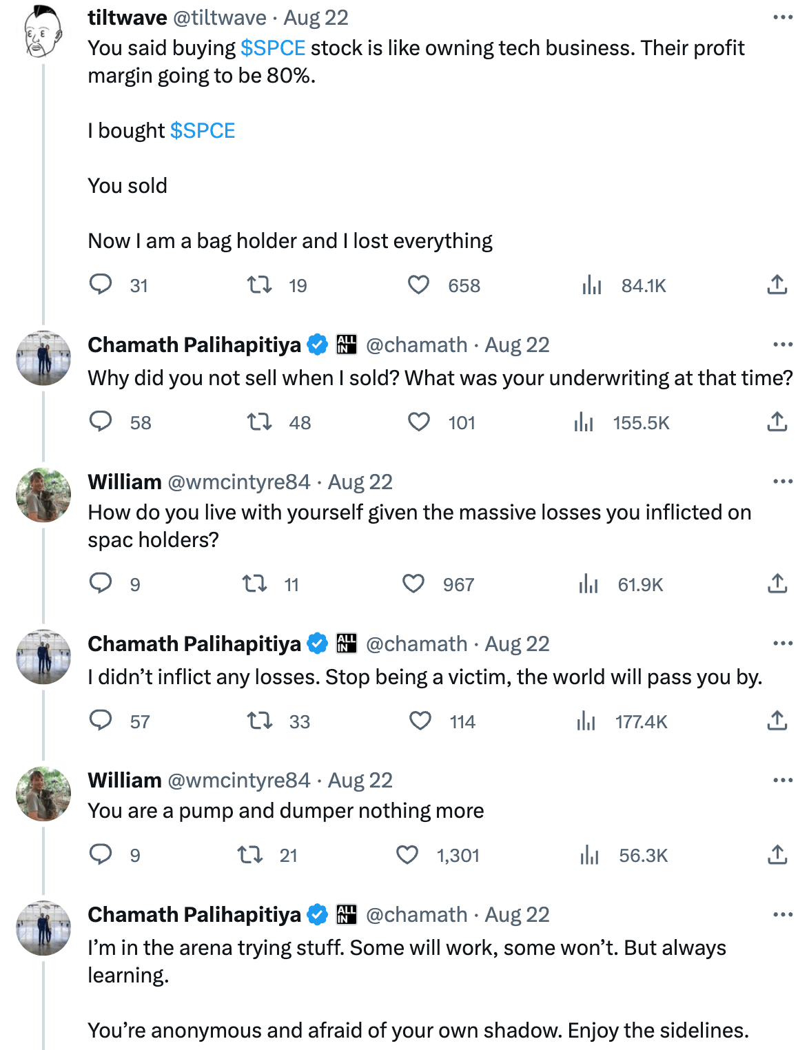 If this was purely a money game, a means to a financial end, it wouldn’t really matter. Did Chamath break any laws? Not that I know of. If anything, he just took advantage of regulatory oversights. And if his Twitter followers were willing to buy what he was selling? Who cares. Take your $750M, go ghost, delete Twitter, and move to a private island.